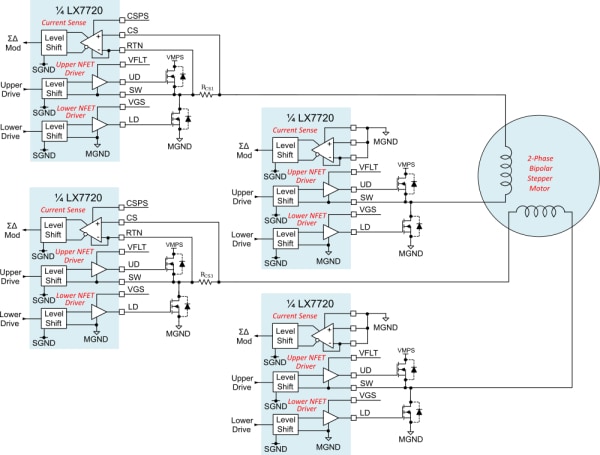 The LX7720 contains four half-bridge driver stages and four current sense amplifiers, which is enough to drive a two-phase bipolar stepper motor.