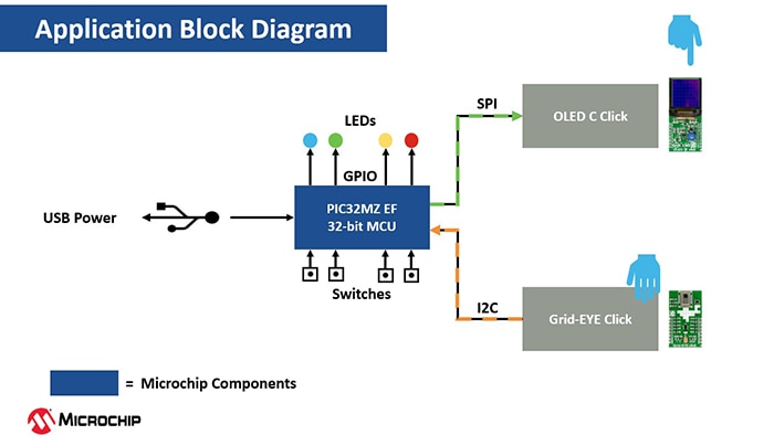 This block diagram helps us understand how the OLED-C click and Grid-EYE click boards interface with the PIC thirty-two MZ EF microcontroller to create a thermal camera-based object heatmap.