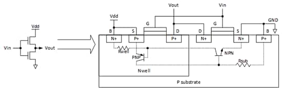Latch-up occurs when the applied voltage causes a Bipolar Junction Transistor (BJT) to turn on unexpectedly, connecting the power to ground or some other lower potential through a low impedance connection. The BJT can be an intentional one (part of the design) when the BJT is forward biased due to an unexpected voltage condition, but most often in a monolithic MOS IC it is an unintentional one formed by intrinsic parasitic PN junctions that exist. When two such parasitic PN junctions form a PNPN device such as a Silicon-Controlled Rectifier (SCR) or thyristor, they can latch up and result in very high current flow, causing localized heating of the IC which can cause permanent damage. See Figure 3 for an example of a typical logic gate schematic and its matching layout showing the resulting parasitic circuit in dashed lines.