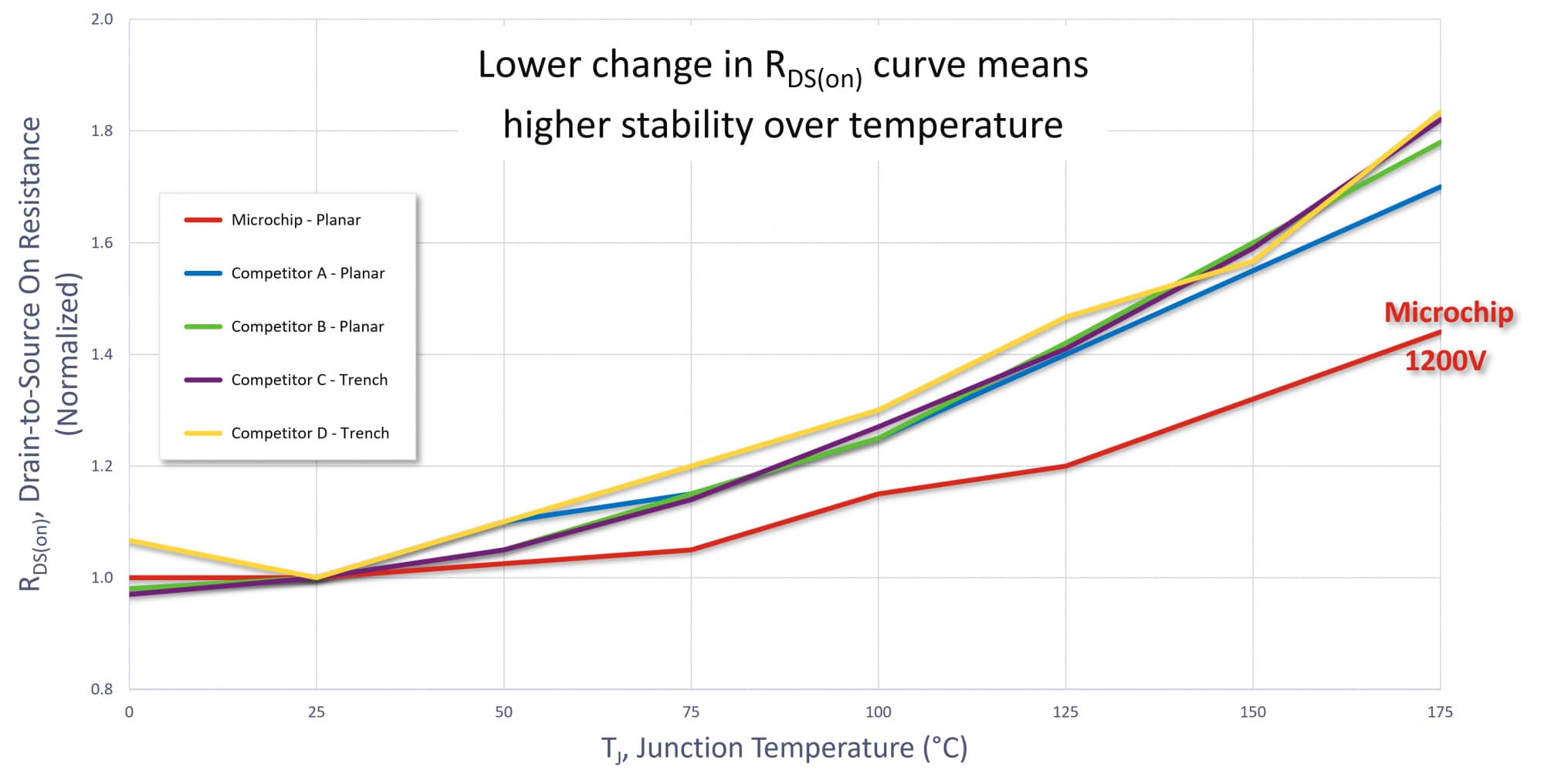 A flatter RDS(on) curve over temperature means the SiC MOSFET device will have greater stability in conduction losses over a larger temperature range, allowing the designer to maintain a tighter margin for thermal management.