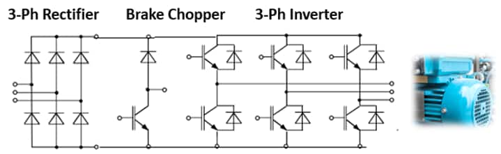 A standard industrial motor drive typically consists of 3-Phase rectifier, Brake chopper and 3-Phase inverter which could be 2 level or multilevel. The LT (< 1000Vac 3-Phase) drive has output voltages between 3-Phase 380V to 690V with nodes such as 415V, 440V and 480V depending on the type of motor and applications. Switching frequency is generally low to medium with around 2KHz for > 100kW and 4KHz for < 100kW though the range may vary.