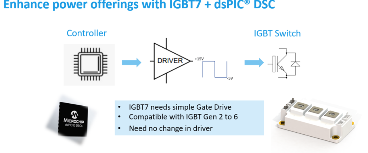 We offer IGBT7 modules in a variety of topologies and package options, making them easy to integrate into both new and existing designs. Simple gate driving requirements and flexible configurations help reduce development time and system complexity. Additionally, IGBT modules can be used along with dsPIC® microcontrollers, choosing an appropriate one to add more value with Microchip offerings.