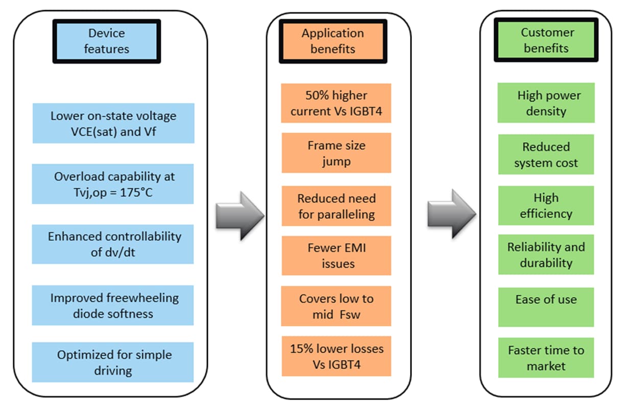 IGBT7 modules are optimized for lower VCE(sat) and Vf, minimizing conduction losses and hence overall power losses up to 20%. This results in higher efficiency, reduced heat generation and the ability to design more compact UPS systems without increasing the cost exponentially as IGBT7 modules offers best in class TCO (total cost of ownership), a key differentiator for UPS system builders.