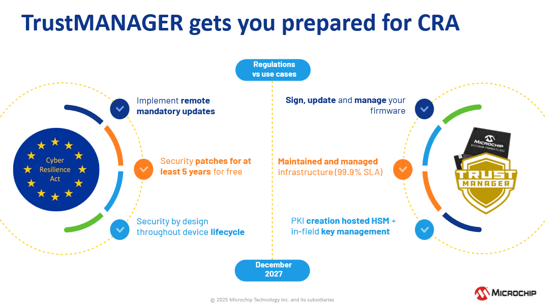 Leverage hardware-based security ICs to simplify compliance. Software-based security can be flexible, but it’s also vulnerable. Hardware-based security ICs offer a trusted foundation for compliance and protection and add robust yet foundational security to help meet CRA compliant standards.