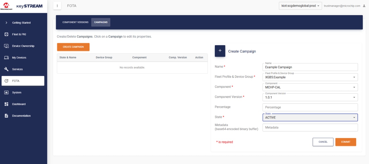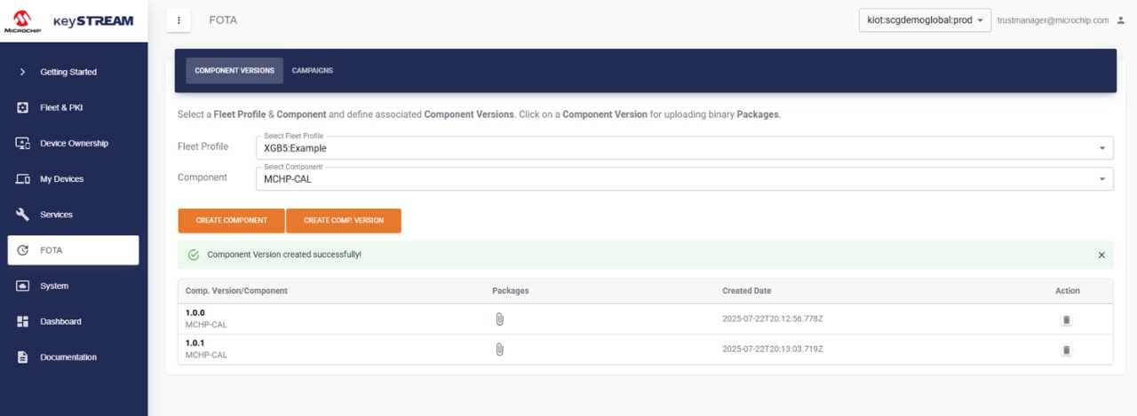Once you have created a device fleet and its associated PKI through the initial keySTREAM set up, you can now create components and component versions that are used to build a campaign which releases the update to the selected fleet of devices. A component is an individual part of the complete firmware. It could be a library, an RTOS, wireless communication stack, application code…