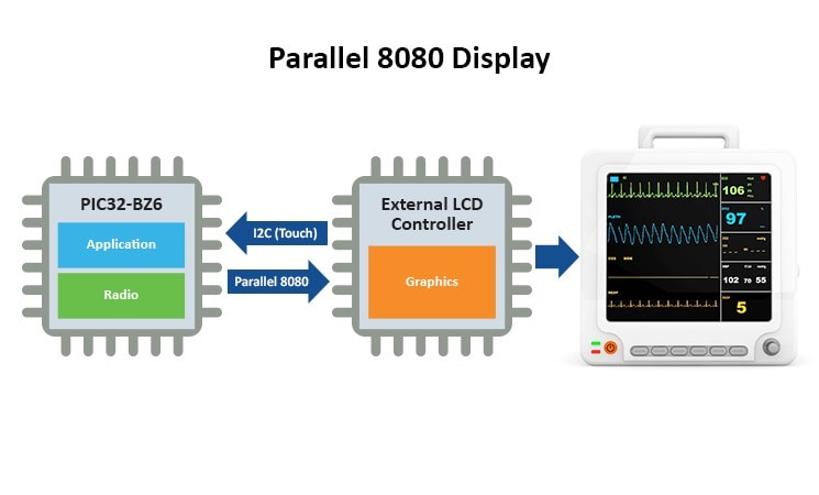 The parallel 8080 interface connects PIC32-BZ6 to an external LCD controller (e.g., ILI9488), which handles the frame buffer and display timing. It supports 16-bit RGB565 color and higher resolutions than LCC up to 320 × 480 pixels.