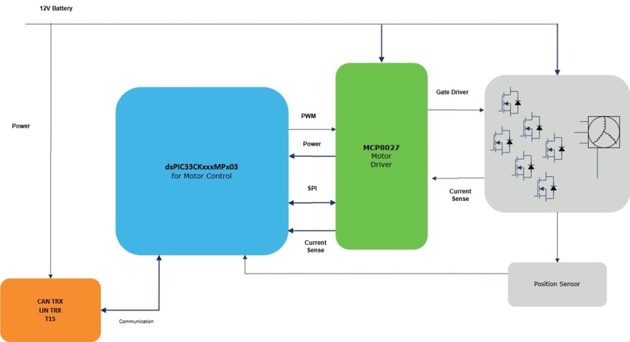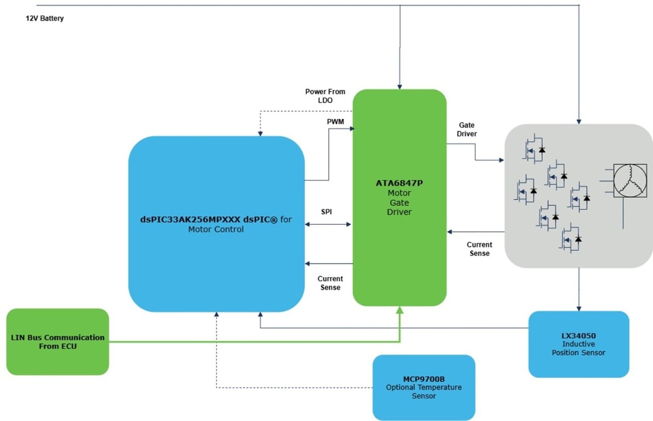 Integrated solutions often provide advanced features such as fault diagnostics, current sensing and protection mechanisms. The status and control is available via SPI interface by the motor controller/MCU and remotely through the integrated LIN transceiver for the ECU to monitor (ATA6847L/P).