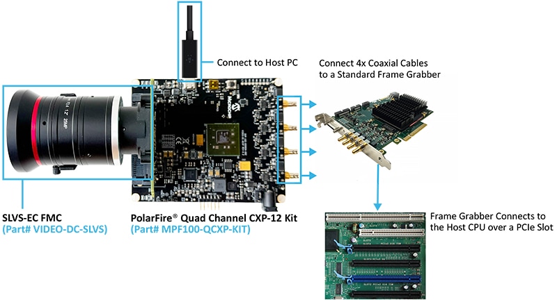 Real-time high-resolution SLVS-EC video captured and transmitted over 4-channel CXP-12 using the PolarFire® FPGA platform, delivering high bandwidth with ultra-low latency.