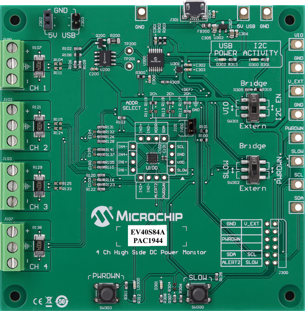 This board enables easy connection of the PAC1944 to power sources and loads for power monitoring and energy metering using on board 4mOhm high side current sensing resistors. It has USB connection to PC and a GUI to display the data, as well as options to disconnect the PC and communicate directly with a different host controller. Measurement channels 1,2 and 3 are pre-populated to show demo currents and they can be switched to the external input sense resistors by moving two 0 Ohm resistors on each channel.