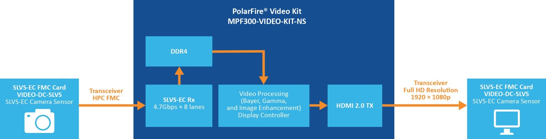 Microchip’s SLVS-EC FMC (VIDEO-DC-SLVS) enables evaluation of Sony’s high-speed SLVS-EC receiver IP on PolarFire® FPGAs for advanced CMOS image sensor applications.