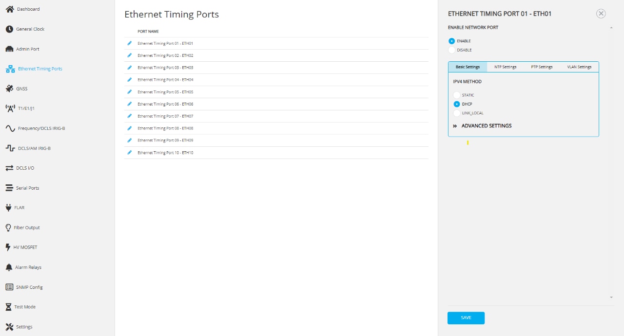 The GridTime 3000 GNSS time server has 10 dedicated 1 Gb Ethernet ports, each equipped with NTP and PTP capabilities. These are connected to a dedicated microprocessor (MPU) to ensure precise and accurate time stamping of packets.