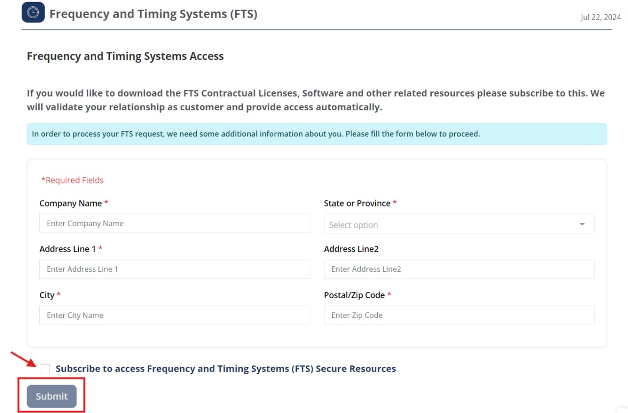 Note: If you have already created a myMicrochip account and provided the required information in the past, you will just see the following screen, without the form. You can just click on the checkbox that says, "Subscribe to access Frequency and Timing Systems (FTS) Secure Resources", and then click on the "Submit" button as shown below.