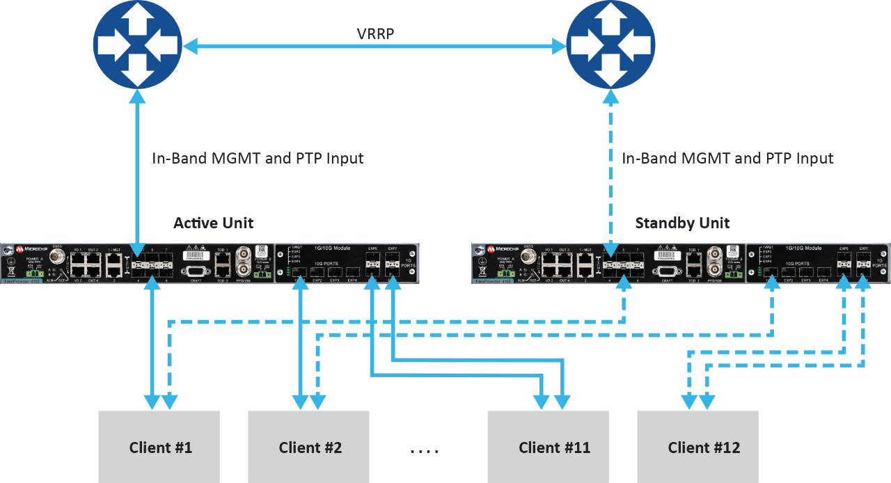 We recommended having two TP4100 Grandmasters in active/active-redundant mode that are connected to multiple cascaded TimeProvider XT extension shelves to provide large-scale E1/T1/CC/JCC output fanout capabilities. Up to five TimeProvider XT extension shelves can be cascaded for a maximum of 200 legacy signals output ports.