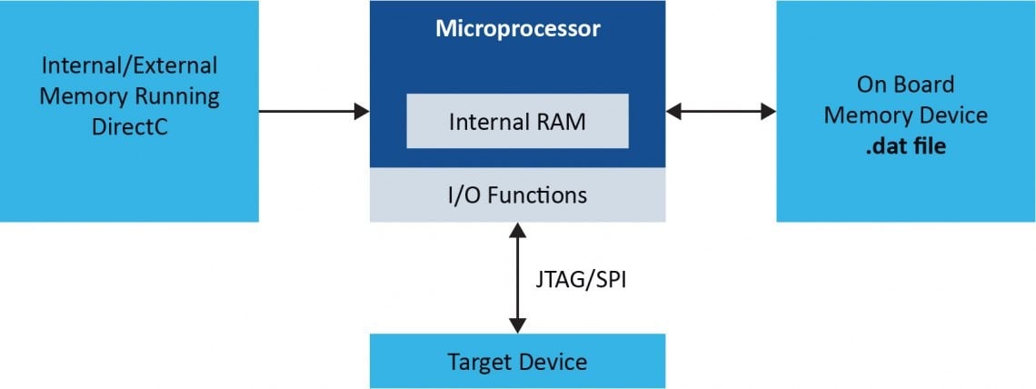DirectC facilitates in-system embedded programming of Microchip FPGAs using an integrated or external microprocessor (MPU) that contains either JTAG-DirectC or SPI-DirectC. These methods use direct and indirect memory access to complete the programming. JTAG-DirectC supports PolarFire® SoC, PolarFire, IGLOO® 2, SmartFusion® 2, RTG4™, ProASIC® 3, IGLOO, SmartFusion and Fusion devices. SPI-DirectC supports PolarFire SoC, PolarFire, IGLOO 2 and SmartFusion 2 devices.