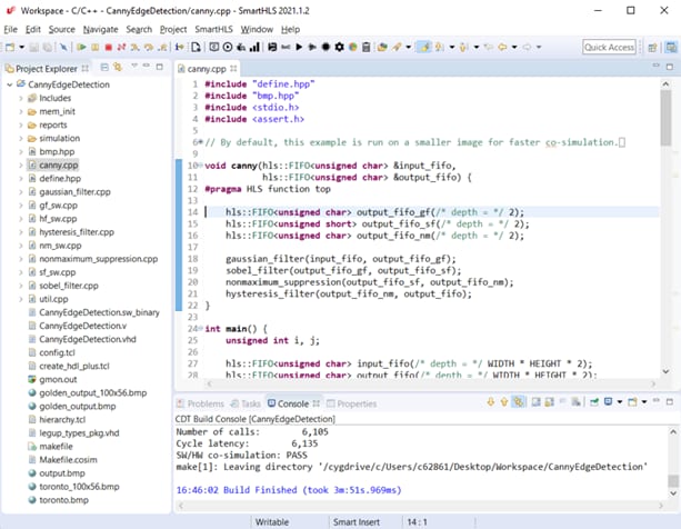 In the SmartHLS compiler software, you can implement your design in C++ software and verify the functionality with software tests. Next, the SmartHLS high-level synthesis software compiles the C++ program into functionality-equivalent Verilog hardware modules. SmartHLS software can run co-simulation with ModelSim to verify cycle-accurate hardware behavior and confirm that the hardware functionality matches the software. SmartLHS software can generate hardware IP cores that you can integrate into a larger system using SmartDesign. It can also run Libero® software synthesis on the generated Verilog to determine the FPGA area and fMAX.
