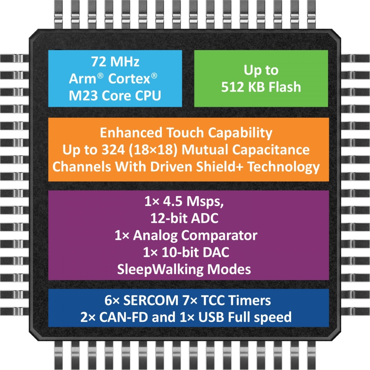 This 72 MHz Arm® Cortex®-M23 MCU enables touch interface functionality in various environments. Its Peripheral Touch Controller (PTC) module supports gesture recognition and touch detection under a variety of rugged conditions, including noise and moisture. The device offers up to 512 KB of Flash memory, IEC SIL 2 compliance and software resources to support safety certification processes.