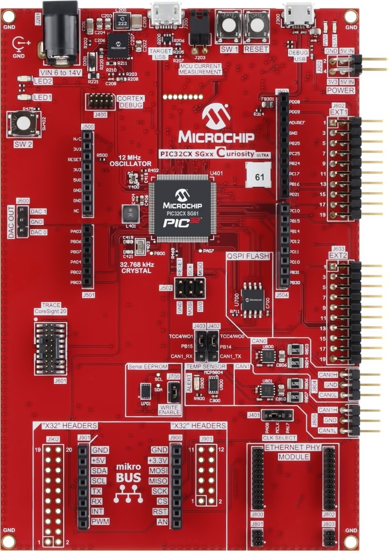 The PIC32CX SG61 Curiosity Ultra Evaluation Board is the hardware platform for evaluating PIC32CX SG61/SG60 MCUs.