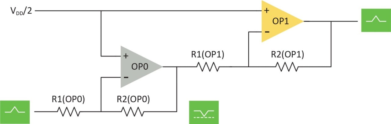 An operational amplifier is a type of analog circuit that is designed to amplify the difference between the inputs non-inverting (positive) and inverting (negative) inputs. Operational amplifiers are commonly used to buffer or amplify signals, such as the signals from sensors, current shunts and resistive dividers. The Operational Amplifier (OPA) module on PIC® microcontrollers (MCUs) and the Analog Signal Conditioning (ASC) module on AVR® MCUs can feature internal resistor ladders that enable the peripheral to function as a Programmable Gain Amplifier (PGA), which increases the size of the signal to maximize the resolution in an Analog-to-Digital Converter (ADC).