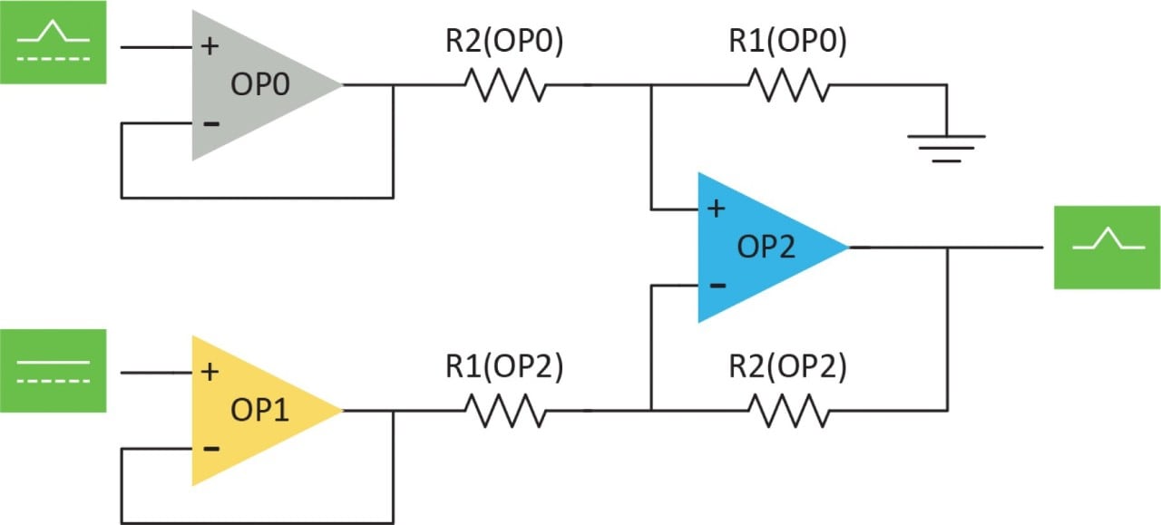 The ADC on the device can directly sample the output of the operational amplifier without an external jumper to another pin. The module can also be used as a buffer for the ADC, which can improve signal acquisition time and resolution.