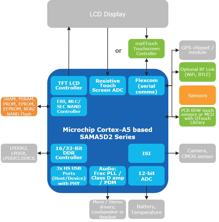High integration, including up to three High-Speed USB hosts with PHYs, ADC for battery monitoring and touchscreens, Class D, digital microphone and I2S™ audio support, multiple SDIO interfaces