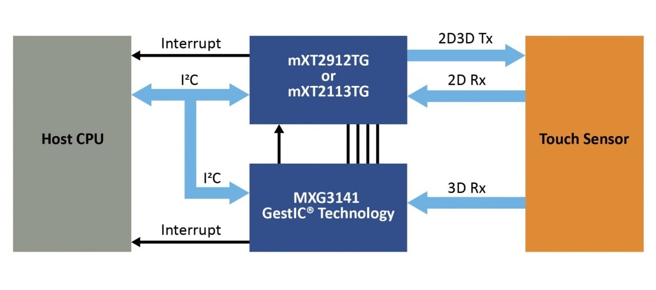 The block digram below demonstrates the simplicity of the circuit. In the 2D touch mode, the mXT2912TG (for touchscreens up to 17") or the mXT2113TG (touchscreens up to 13") perform the 2D touch acquistion. In 3D proximity mode, the entire touchscreen is the emitting X electrode driven by the maXTouch touchscreen controller. Four additional Y elecrodes connected to the GestIC technology controller will detect any approaching movement and/or air gestures. Both controllers communicate the values through the I2C bus to the host controller.
