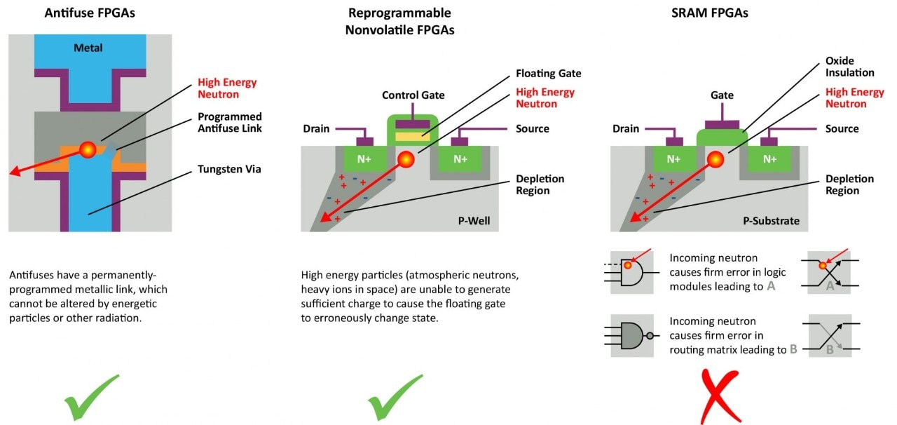 Our antifuse and Flash FPGA configuration cells are immune to Single-Event Upsets (SEUs).