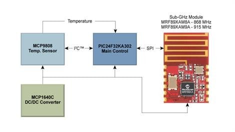 The Wireless Temperature Sensor reference design is part of our Connected Home platform. At the heart of the design is a low-power nanoWatt XLP 16-bit PIC® microcontroller, the PIC24F32KA302. The MCP9808 temperature sensor has an operation range from −40°C to +125°C. The temperature data is transmitted via the MRF89XAM8A/9A sub-GHz wireless module. Two AA batteries provide power to the board.