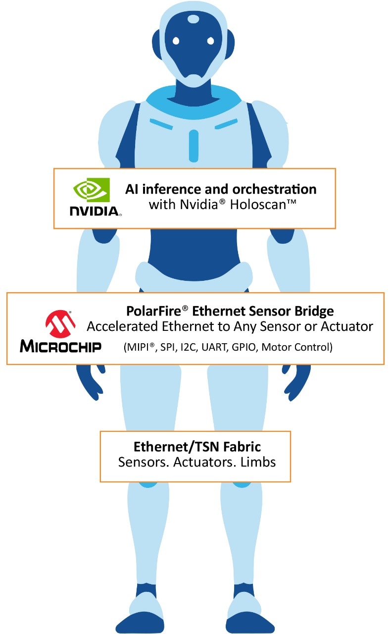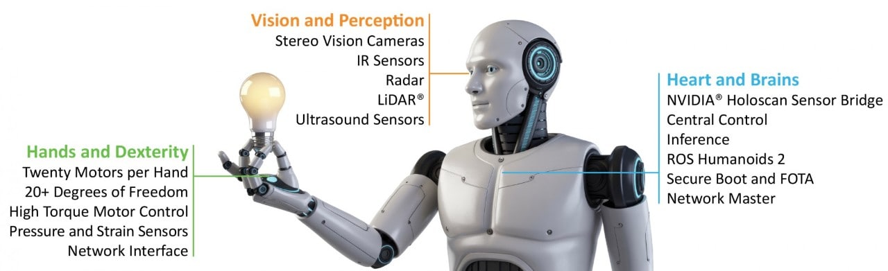 With NVIDIA Holoscan software libraries, hardware-accelerated I/O and ROS 2 integration, sensor data flows directly into AI pipelines with assured timing. Scalable from 10 Mbps to 100 Gbps and PHY-agnostic (BASE-T, optical, SPE, direct-attach), the fabric adapts to any limb or embodiment.
