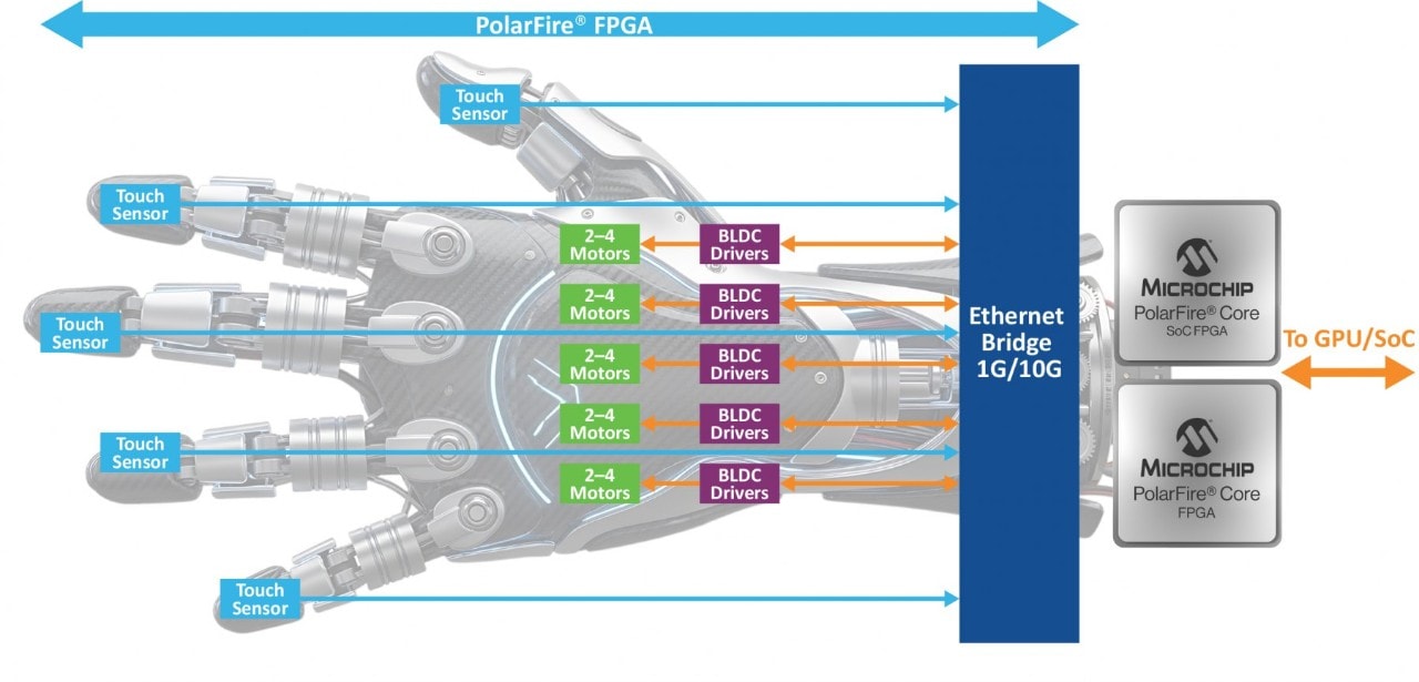 A humanoid hand can contain 20+ degrees of freedom, with two to four motors per finger, embedded torque and position sensing, and tactile feedback at the fingertips—all requiring tightly synchronized, real-time control. With PolarFire FPGAs, you can use features that include: