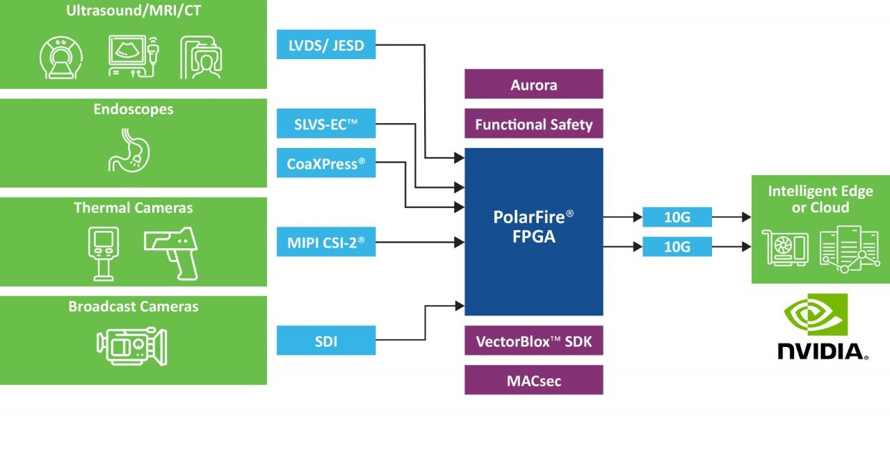 The PolarFire Ethernet Sensor Bridge aggregates MIPI®, SPI, I2C, UART and GPIO into deterministic Ethernet streams for NVIDIA® Holoscan.