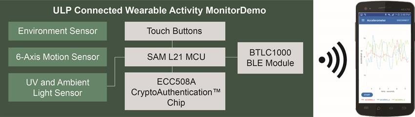 Our ULP Connected Wearable Activity Monitor Demonstration board features the SAM L21high-performance, 32-bit Arm® Cortex®-M0+ based microcontroller (MCU) with Ultra Low-Power technology, the BTLC1000 4.1 Bluetooth Low Energy Module, the ATECC508A CryptoAuthentication™ IC as well as movement and environmental sensor chips.