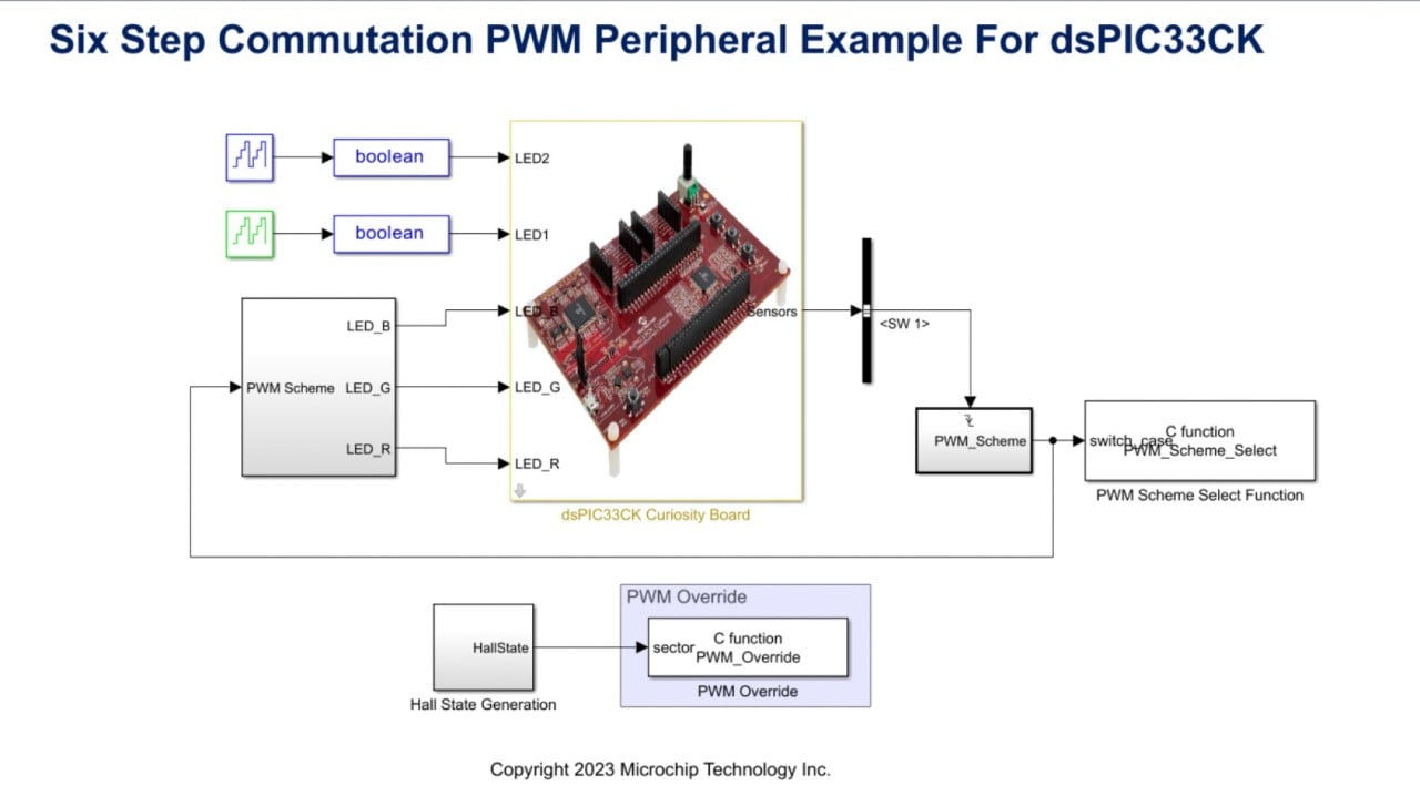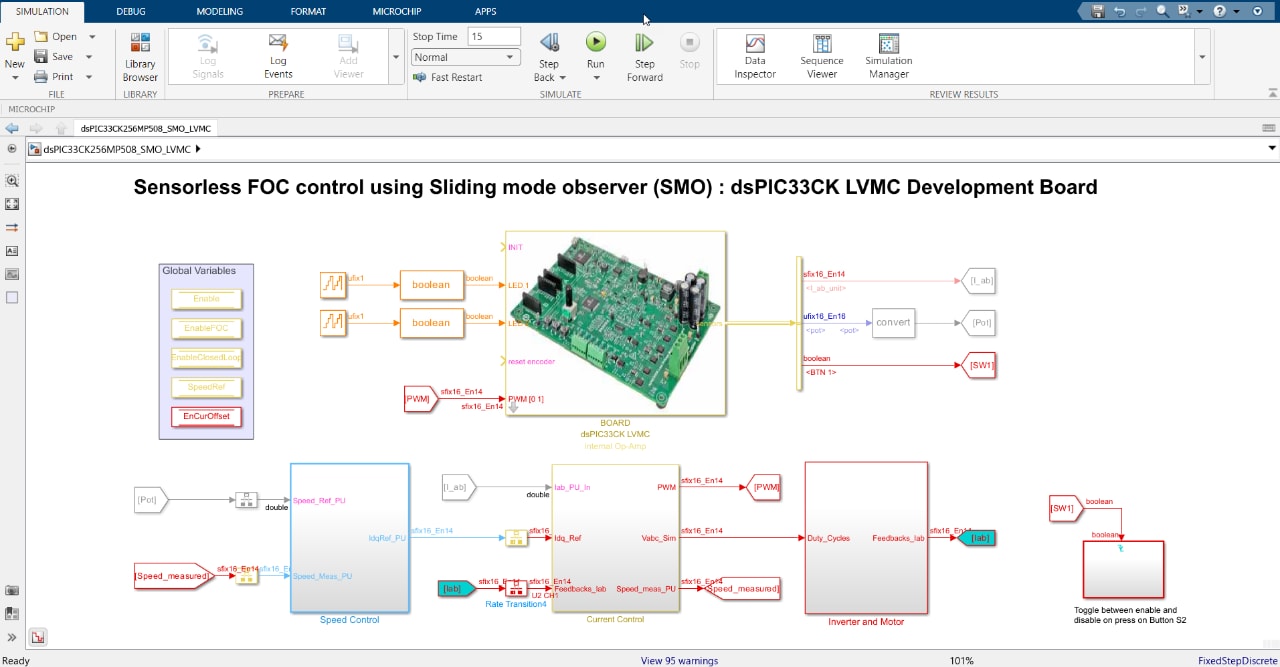 You can simulate a control algorithm, generate the code and program a dsPIC® DSC or SAM MCU from the Simulink model. You can use the MPLAB X IDE for the final tuning of the code generated from the model.