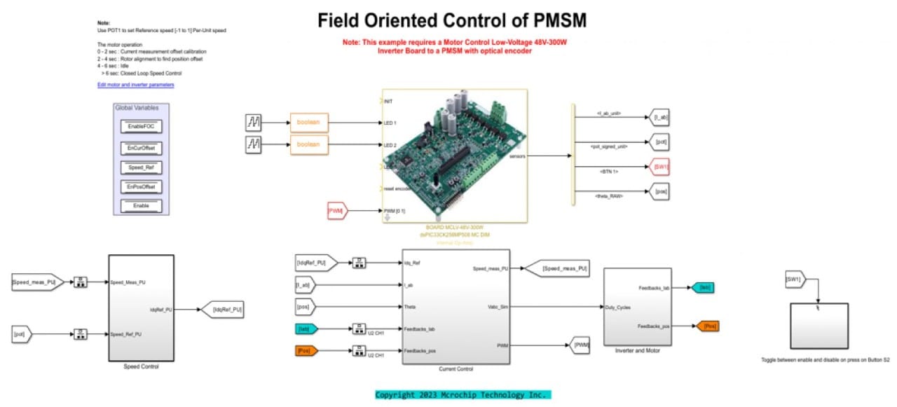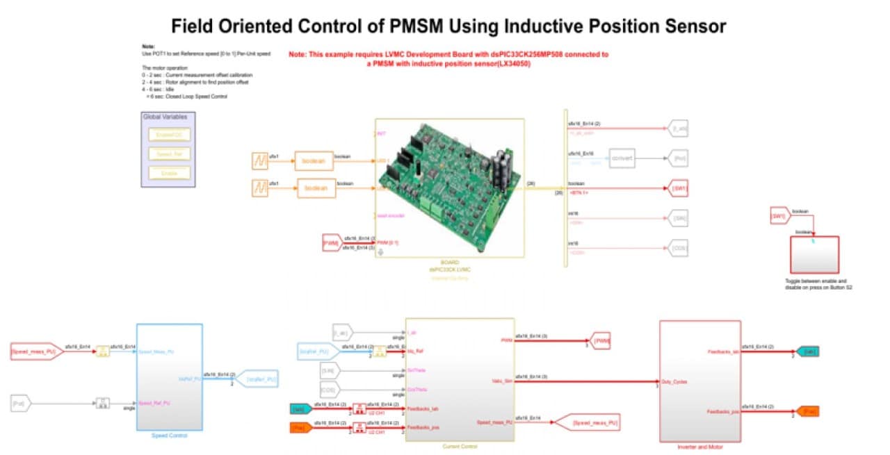 Create stand-alone applications from a Simulink discrete time model and with just one click generate, compile and load the code for your application onto your target device. The MPLAB Device Blocks for Simulink is a free set of user interfaces and Simulink peripheral blocks for developing complex designs based on our dsPIC33 DSCs and PIC32, SAM E70, SAM E5x, SAM D2x and SAM C2x MCUs. The package also includes many examples in the form of demo models to further simplify your development, such as a complete Permanent Magnet Synchronous Motor (PMSM) and Brushless DC (BLDC) motor control applications.