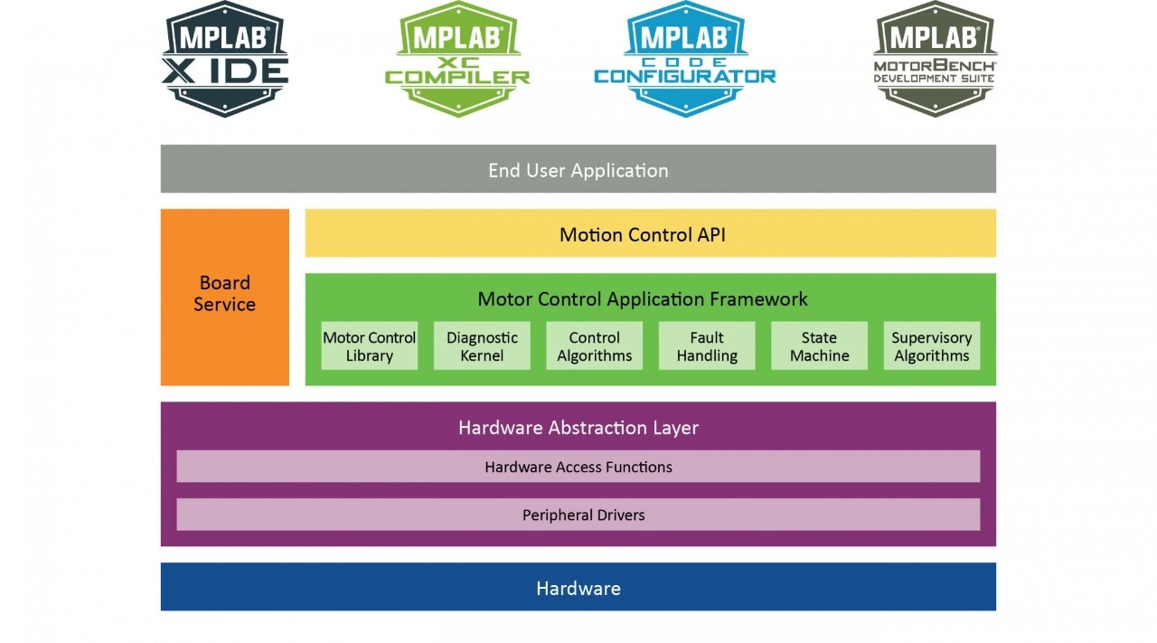 The Motor Control Application Framework (MCAF) is a firmware framework for motor control applications on dsPIC® DSC devices. The motorBench Development Suite generates the source code from this framework along with a Hardware Abstraction Layer (HAL) for the chosen hardware.