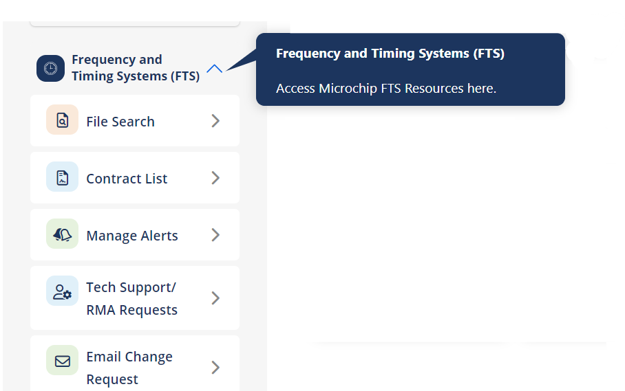 When you are notified that your request has been approved, log into your myMicrochip account and go to your dashboard. You will now see the "Frequency and Timing Systems (FTS)" sub-menu has been updated to provide you with these options: