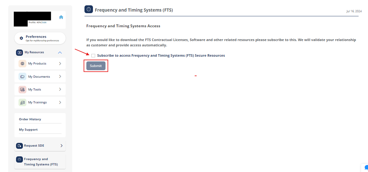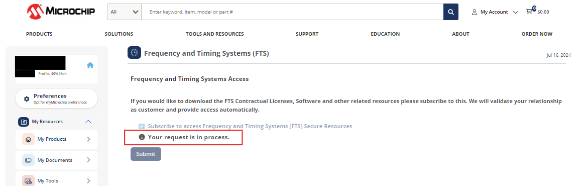 Note: If you have already created a myMicrochip account and provided the required information in the past, you will just see the following screen, without the form. You can just click on the checkbox that says, "Subscribe to access Frequency and Timing Systems (FTS) Secure Resources", and then click on the "Submit" button as shown below.