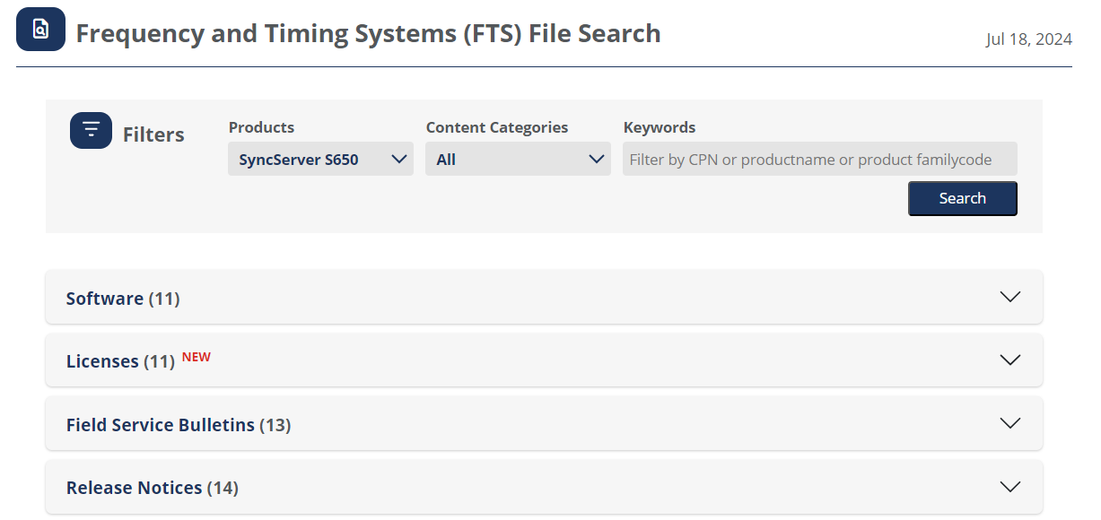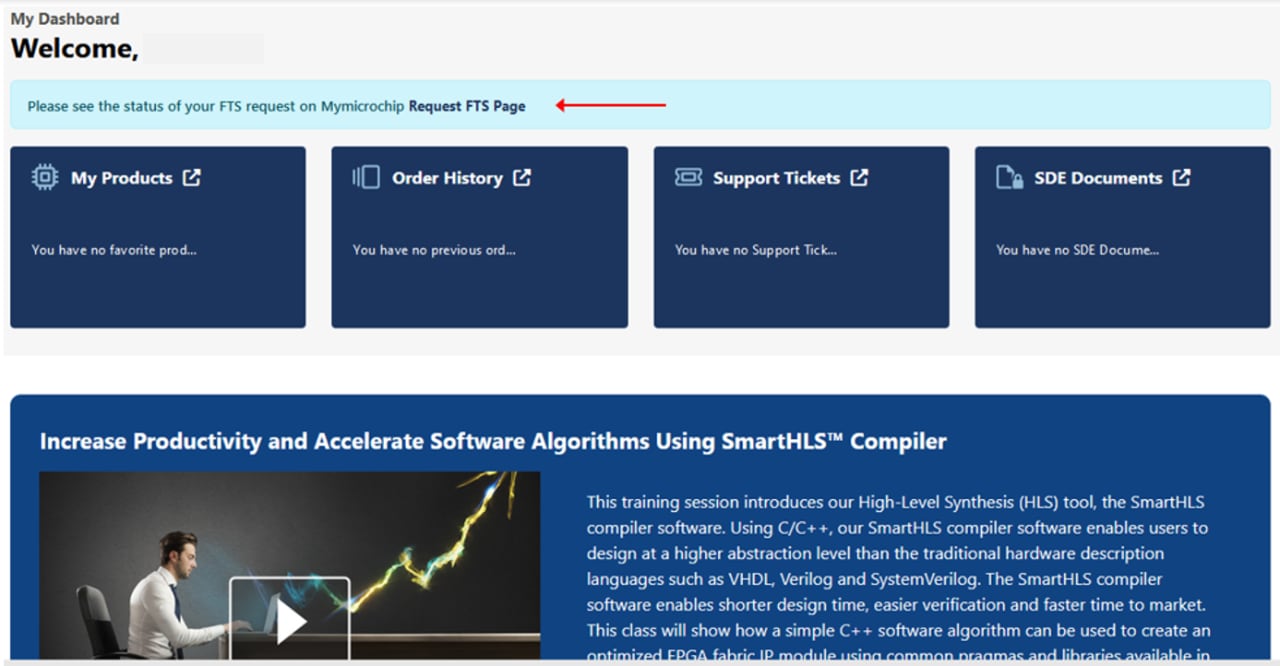 When you are notified that your request has been approved, log into your myMicrochip account and go to your dashboard. You will now see the "Frequency and Timing Systems (FTS)" sub-menu has been updated to provide you with these options: