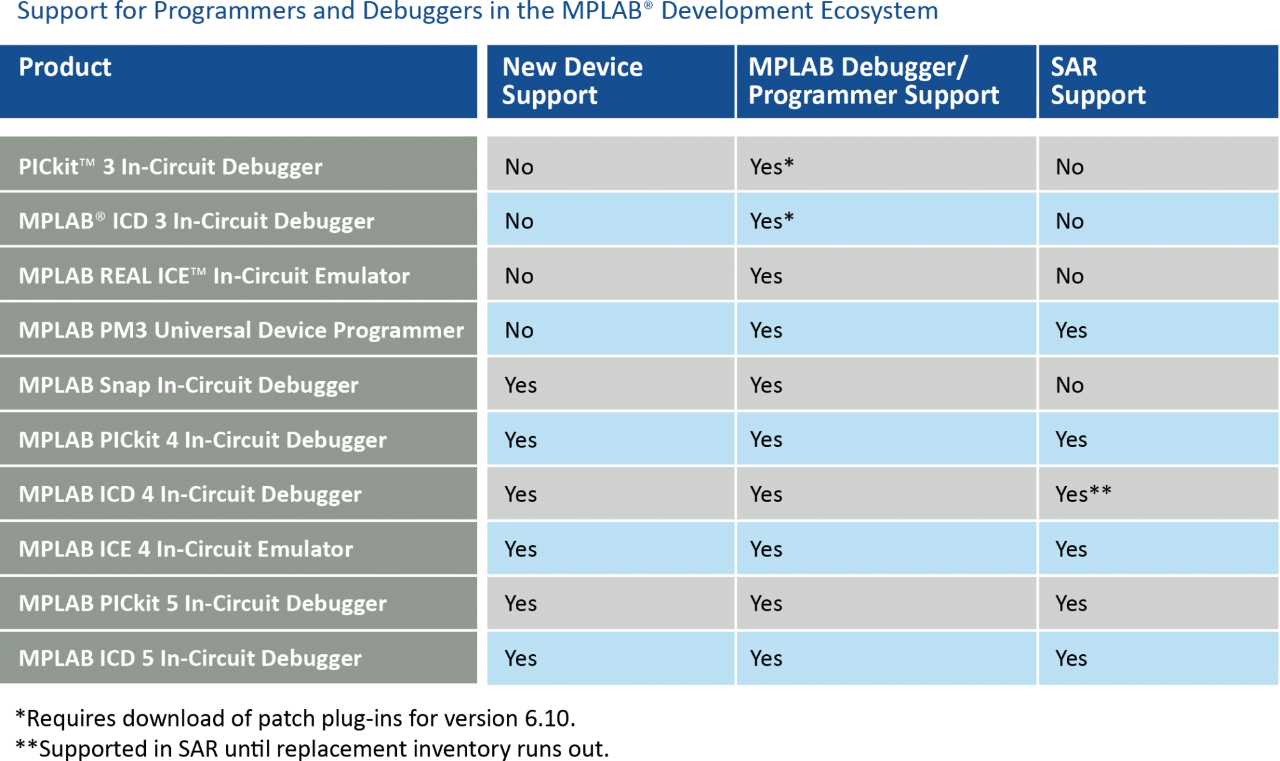 Feature   MPLAB® ICE 4 In-Circuit Emulator, Programmer, Debugger MPLAB ICD 5 In-Circuit Debugger, Programmer MPLAB PICkit™ 5 In-Circuit Debugger, Programmer MPLAB Snap In-Circuit Debugger, Programmer MPLAB PICkit™ Basic In-Circuit Debugger, Programmer Atmel-ICE Power Debugger